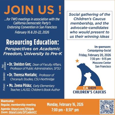 2) Delegates (and friends) attending the Convention in person at the Moscone Center in San Francisco are invited to JoinUS! for an election season Campaigning-Social, including candidate-introductions at the mic around children's issues for your consideration.