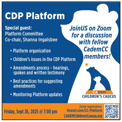 Join CademCC for an informational get-together around children's issues in the CDP Platform. We're pleased for the guidance of special guests Shanna Ingalsbee, one of the current CDP Platform Committee's co-chairs, and also long-time CademCC member, Adam Seiden, former Senior Advisor to CDP.